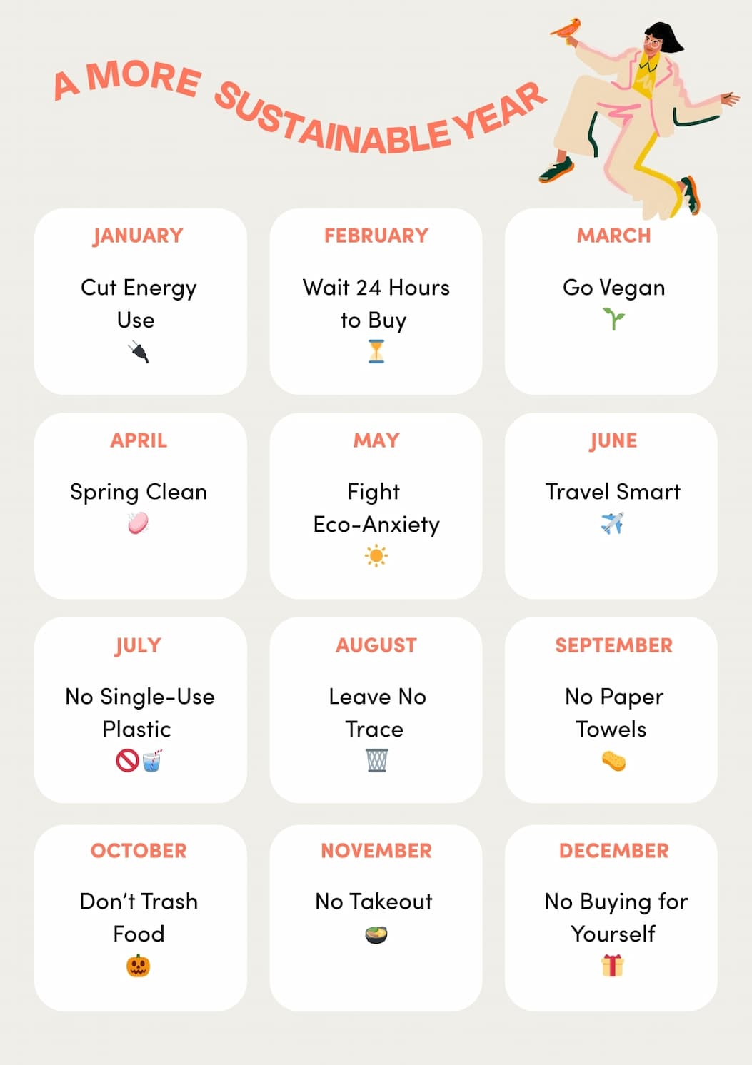 In the (rough) words of Bob Wiley, there are two types of people: those who love New Year’s Resolutions and those who would rather eat a compostable solo cup. We’re not here to judge. But we are bringing back Finch’s monthly resolutions so you can dip a toe—or do a full cannonball—into bite-sized sustainability goals. No pressure, no guilt. Just a few ideas to help you kick off 2026 with more intention (and maybe less plastic). We ran similar ones in 2021, so consider this a Finch Facelift from days of yore…